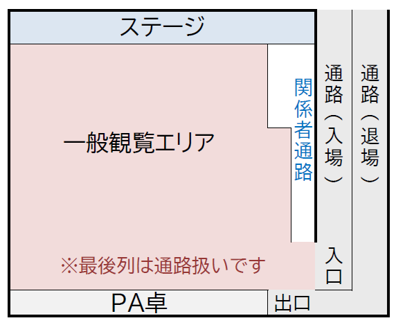 このステージは比較的緩いほうで、ライブハウスのように好きな場所で見ることが出来ます。あとステージが始まって最初の方がガラガラでも曲が進むにつれて埋まって来るという傾向があるステージです(ステージが始まってから客入れするため)