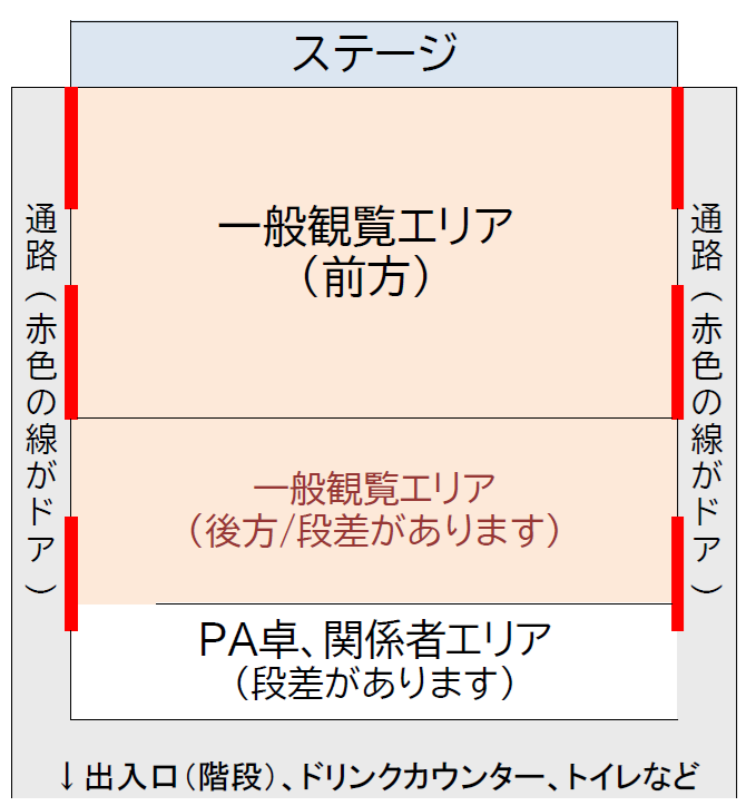 通路を奥の方に行けばいくほどステージ前のほうにたどり着けますが、場合によっては入る場所に規制がかかるかもしれません。