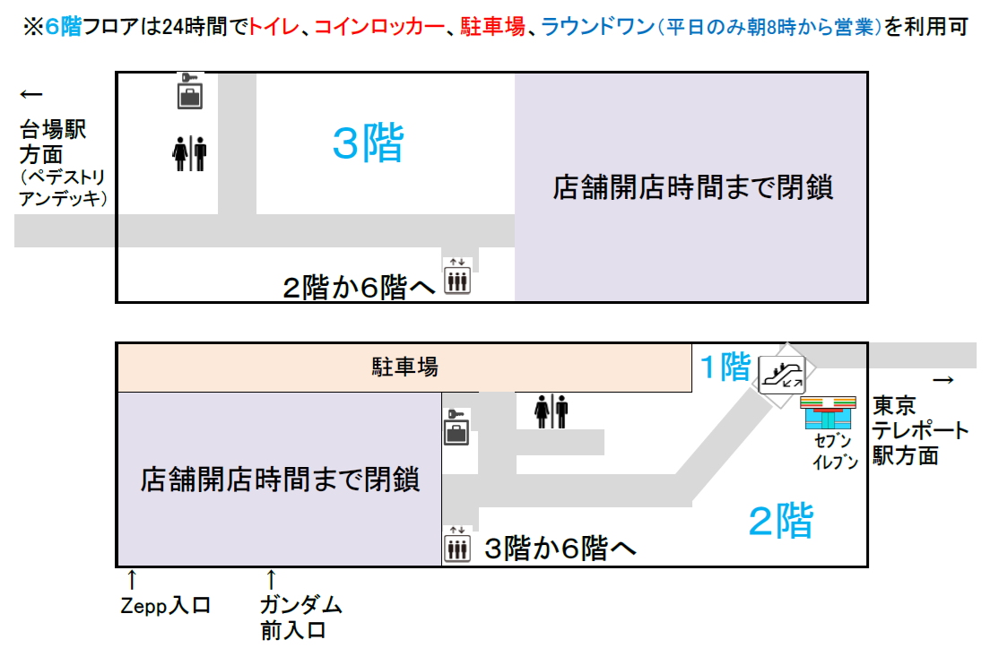 店舗開店時間(平日11時、土日祝10時/一部店舗除く)までのダイバーシティプラザは東京テレポート側の1階~2階入口が24時間開放、台場駅側の3階入り口が朝7時頃から開放されます。建物を横断する際は以下の通りエレベーターで階を移動します(※画像を拡大してご覧ください)。